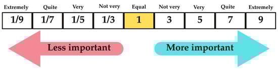 Quantifying the judgment between two criteria in many cases involves difficulties associated with errors in measuring attributes, impartiality in assessments and the availability of information, as well as inaccuracies and ambiguities inherent in the paired analysis procedure [71]. Thus, it is possible to use the scale of relative importance. Thus, a measure of the relative importance between two alternatives is established based on the absolute scale, facilitating the decision-making process. The evaluator must initially judge whether criterion “A” is more or less important than criterion “B”, and if so, estimate the degree of this difference. To do this, weights are assigned according to the proposed scale in order to quantify this perception. The pairwise comparison followed the scale composed of values lower than one (1) for variables defined as less important: 1/9 (extremely), 1/7 (very much), 1/5 (quite) and 1/3 (not very). The variables with higher weights have, as reference values, 3 (a little), 5 (a lot), 7 (quite a lot) and 9 (extremely), as illustrated in Figure 3.