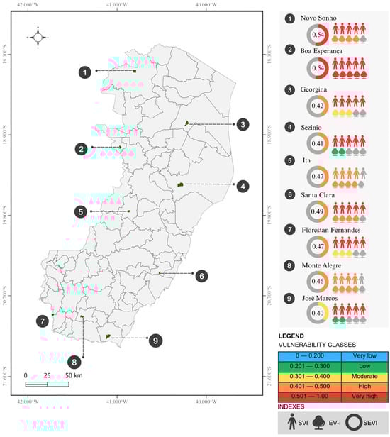 Socioenvironmental vulnerability has emerged as an important issue in recent debates on sustainable development [52,53], especially in rural communities that face challenges arising from the interaction between social, economic and environmental dynamics [54,55]. The scenario in the state of Espírito Santo is marked by a diversity of rural realities, environmental degradation [56], economic dependence on agricultural activities [57] and exposure to extreme weather events, which contribute to accentuating the vulnerability of these populations [58].