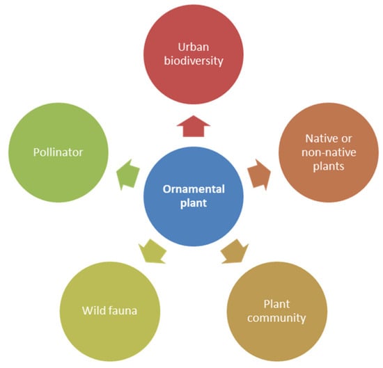 The aim of this literature review was to investigate the contribution of ornamental plants to biodiversity in urban areas, trying to quantify their role and to understand whether, and to what extent, the choice of species and particular cultivation practices could increase biodiversity. To this end, a thematic approach was adopted to identify and select the relevant literature. The search was conducted in Web of Science, Scopus, and Google Scholar. In particular, a deductive approach was used to collate previous research, organizing the results according to the following themes: (1) definitions of ornamental plants; (2) the relationship between biodiversity and urban environments; (3) the contribution of native and or non-native plants; (4) the role of plant communities; (5) the effects of ornamental plants on the diversity of wild fauna; and (6) the relationships among ornamental plants, pollinators, and other type of wild fauna. The main criterion was the functions of ornamental plants (Figure 1).