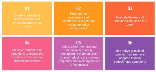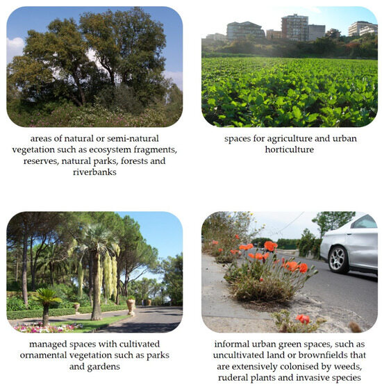 The recognition of the social value of urban ecosystems has led to a greater emphasis on connecting people with nature through conservation in urban areas [67] and an understanding of its central role in global policies on ecosystem restoration (e.g., UN Decade of Ecosystem Restoration https://www.decadeonrestoration.org/generation-restoration-cities, accessed on 12 February 2025). However, the highly fragmented nature of the urban landscape presents barriers to the natural recolonization of restored sites for many species, and active translocations may be needed to overcome the obstacles to their dispersal [68]. While areas of natural or semi-natural vegetation have received more attention, inadequate attention has been paid to the biodiversity provided by informal or unmanaged urban green spaces [69]. Cities display different kinds of green areas according to Heywood [69], with some reported in Figure 3. The fourth group of vegetation cover reported in Figure 3 is the result of different land uses and their intensities of use and maintenance, thus providing different ESs [70].