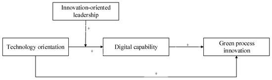 Knowledge management theory further posits that digital capabilities can accelerate knowledge transformation through three mechanisms: first, data standardization breaks down knowledge silos; second, algorithmic modeling facilitates the explicit articulation of tacit knowledge; third, real-time feedback loops foster continuous improvement cycles [21,22]. Hambrick’s upper echelons theory suggests that managerial cognitive frameworks shape the pathways of organizational change [23]. Innovation-oriented leadership can strengthen the synergy between technology orientation and digital capability by establishing a long-term vision to counteract short-termism, creating a tolerance mechanism to support technological iteration, and reshaping organizational structures to enhance knowledge flow [24,25]. By constructing an integrated analytical framework centered on “technology orientation–digital capability–GPI” and introducing innovation-oriented leadership as a moderator, this study enables the formation of a multidimensional theoretical explanation system and provides a concrete theoretical response to the practical challenge of the “technology-to-performance gap” observed in firms’ innovation practice.