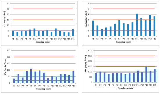 In all 15 sampling points, the concentration of Cd and Cu has higher values than the reference normal value. Cu concentration slightly exceeded the alert threshold (100 mg kg−1) for sensitive soils in P5 (110.6 mg kg−1). In the case of Cd ions, it was found that in five points, the alert threshold for soils with sensitive uses (3 mg kg−1) was exceeded, up to 3.88 mg kg−1 (P14) and 4.11 mg kg−1 (P11), respectively. Of the 15 soil sampling points, in 10 points, the concentration of Mn exceeded the normal value, and in P13 (1538 mg kg−1), the alert threshold was slightly exceeded. In the points located neighboring the area of the tailing ponds the values of Cd (P11, P12, P14), Cu (P5), and Mn (P13) overrun the alert thresholds, and the values of Cd (P6–P8, P10, P13), Cu (P6–P8, P15), and Pb (P11–P13) are very close to the alert thresholds. These higher values could be influenced by occasional dust carried by air currents from the surface of the ponds in the area [8,40,68,69,70].