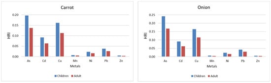 The DIM and HRI values were lower than 1 in all cases analyzed, regardless of the type of metal or plant examined, indicating a low risk to human health. However, these values are consistently higher in children, reflecting a higher exposure to body weight. In particular, the HRI values highlight a potential increased vulnerability among children, especially in the case of carrot and onion consumption. The results also highlight the importance of continued surveillance, given the greater sensitivity of children to food contaminants.