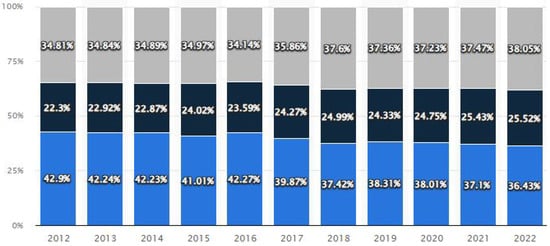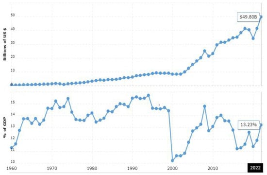 In addition, according to the 2021 statistics, the sector accounted for around 13% of the country’s GDP, which makes it a substantial economic contributor [33]. The total manufacturing output of Pakistan during 2022 was $49.80 billion, 20.05% higher than in 2021; in 2021, it increased by 20.96% to $41.49 billion, 20.96% higher than in 2020; in 2020, it was $34.30 billion, 15.09% lower than 2019; and in 2019, it was $40.39 billion, about 2.5% lower than 2018 [33]. Figure 2 shows the history of total manufacturing output and its percentage in GDP from 1960 to 2022.