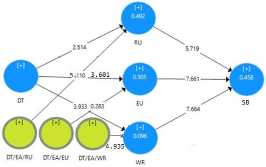 The research survey instrument of this study was based on seven constructs. All seven construct items were adopted from former studies, considering the reliability and validity of the scales. For DT, the items were taken from [144], for EA from [145], for RU and EU from [146], for WR from [147], and for sustainability from [148]. All the constructs’ items were measured with a five-point Likert scale, where 1 represents the lowest level of the agreement while 5 represents the highest level. Appendix A lists all the constructs with their corresponding items and sources of adoption.