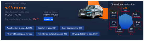 There are seven evaluation indicators derived from the rated eWOM data, namely, space, configuration, cost-performance, interior, appearance, fuel consumption, and driving experience, as shown in Figure 1. The rating indicator set and its corresponding weight set are formally defined as follows: