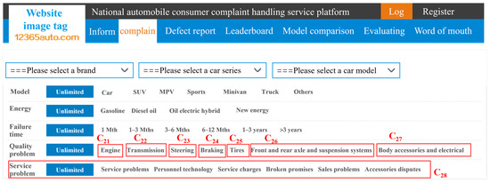 There are eight evaluation indicators for customer complaints, namely, engine, transmission, steering, braking, tires, front and rear axle and suspension systems, body accessories, and electrical and service issues, as shown in Figure 2. The complaint indicator set and its corresponding weight set are formally defined as follows:
