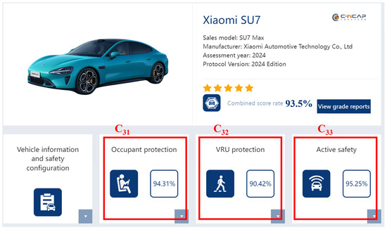 There are seven evaluation indicators derived from the rated eWOM data, specifically, occupant protection, VRU protection, and active safety, as shown in Figure 3. The safety test indicator set and its corresponding weight set are formally defined as follows: