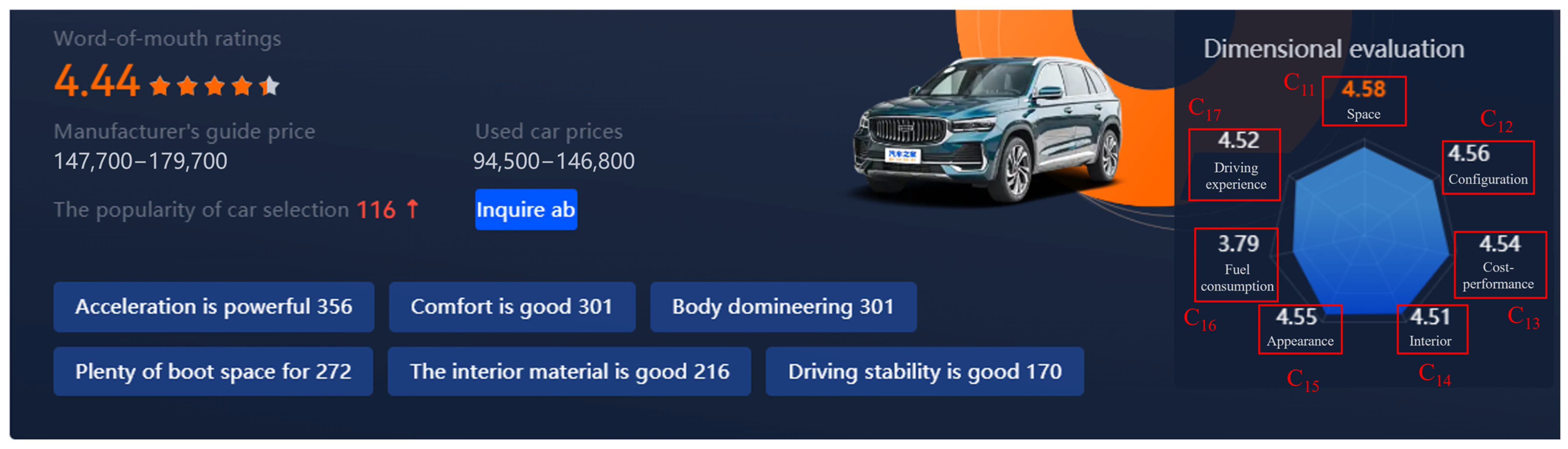 EWOM ratings and their corresponding evaluation indicator on the Autohome website.