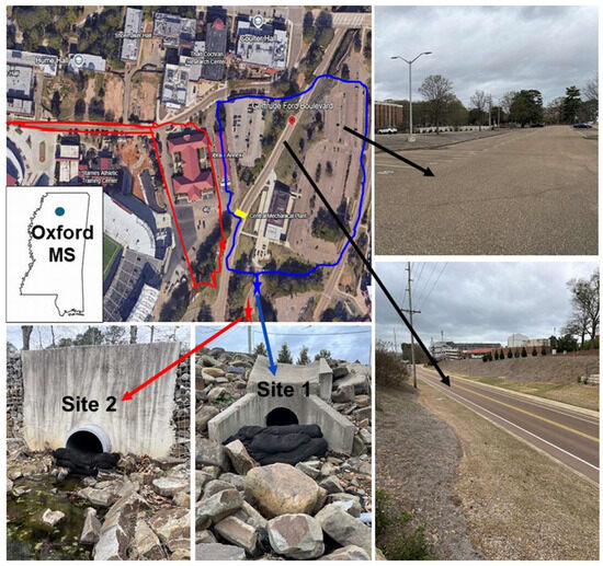 Study site showing (1) the location of Oxford in Mississippi (inset), (2) an aerial view showing the sampling sites (blue star = site 1, red star = site 2) and the approximate drainage area for each (top left), (3) photos of the sampling sites with the filter socks in place (bottom), and (4) photos of a drainage area 1 including a portion of the parking lot and Gertrude Ford Boulevard (right). Note, a pedestrian crosswalk is highlighted in yellow in the center image, and the drainage for area 2 (red) is piped under the road to exit at sampling site 2. Photos taken by the authors (J.V.C.).