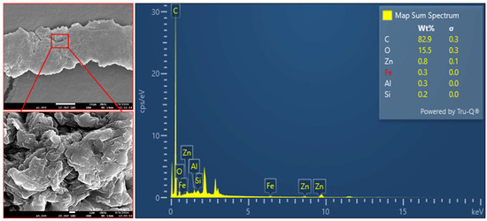 Putative TWPs, biochar, and woodchips were also examined by SEM and EDX analyses for particle morphology, surface properties, and elemental compositions. As noted, TWPs tend to have features such as jagged edges, rough surfaces, and cylindrical or elongated shapes. They also have an elemental composition, with high levels of carbon and oxygen along with silicon, sulfur, zinc, iron, aluminum, and calcium. Combining these morphological and textural parameters with elemental fingerprints provides a way to recognize and differentiate TWPs [64]. Here, particles from the filter were transferred onto SEM stubs covered with carbon tape by touching the stub to the filter. Ten particles resembling TWPs were then imaged and analyzed by field emission SEM-EDX (JSM-7200FLV, JEOL Ltd., Akishima City, Japan). Samples were sputter-coated prior to analysis with a 60:40 gold to palladium ratio. Analysis was conducted under a vacuum pressure of 10−4 Pa, with the electron beam accelerated at 15 kV. Particles of biochar and woodchips were also analyzed in the same manner.