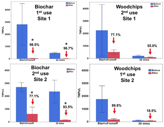 For the woodchips, similar trends were observed (Figure 4). At sampling site 1, at the start of the storm, the average TWP concentration (TWPs/L) before filtration was 2255 ± 2064 compared to 511 ± 176 after passing through the woodchip filter socks, a reduction of 77.3%. However, after 30 min, the TWP concentrations decreased from only 200 ± 67 before filtration to 90 ± 24 after filtration, a reduction of 55% at this time point. Overall, the woodchip biofilter had an average reduction of 66.2% during the first flush. Paired t-tests revealed no statistically significant differences (p > 0.05) between pre- and post-filtration TWP concentrations, both at the onset of runoff and after 30 min.