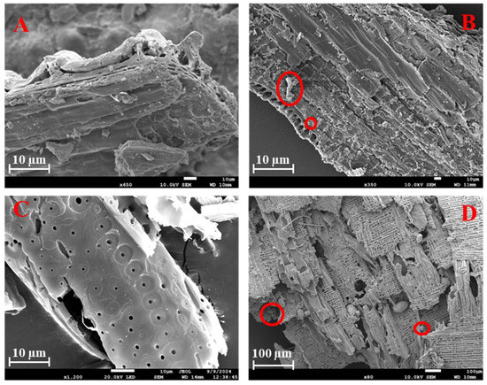 SEM images of rice husk biochar before interacting with stormwater runoff (A) and after a storm event (B) and similar images for pinewood woodchips before (C) and after (D). Note particles trapped or on the surface of the materials circled in (B,D).