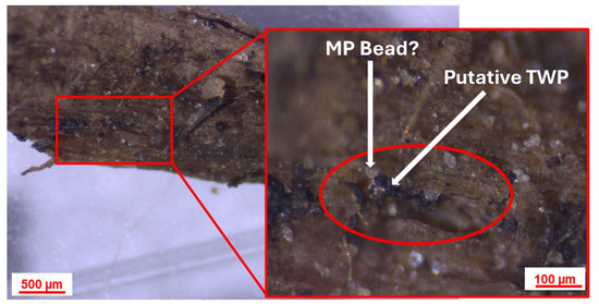 Optical images of woodchips at 40× (left) and 100× (right) magnification after deployment showing putative TWPs and possibly a microplastic bead trapped in the matrix.