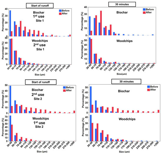 Smaller-sized TWPs are more likely to be transported over greater distances compared to larger particles, which more readily settle in drainage channels and gullies [83]. As such, it is important to characterize the size of TWPs, both in the initial stormwater runoff and post-filtration by both the biochar and woodchips. In this study, the majority of the TWPs were between 30 and 70 μm, with an average particle size of ~90 μm (Figure 7). It is important to note that particles <30 μm were excluded from this study due to sample preparation procedures (see Section 2.3). For biochar, the smaller particle size fractions (30–70 µm) showed a decreased percentage of particles after filtration. However, the percentage of particles increased after filtration for the larger particle size fractions (>90 µm) (Figure 7). For woodchips, the first use had a similar pattern to the biochar, albeit to a lesser extent, but that changed in the second use, where the distribution pattern was essentially the same for both before and after samples. This suggests that biochar was particularly effective at removing smaller particles, perhaps due to its larger surface area and pores, as can be seen in Figure 5, and that woodchips can also trap smaller particles but become less effective with use, possibly reflecting saturated trapping sites.