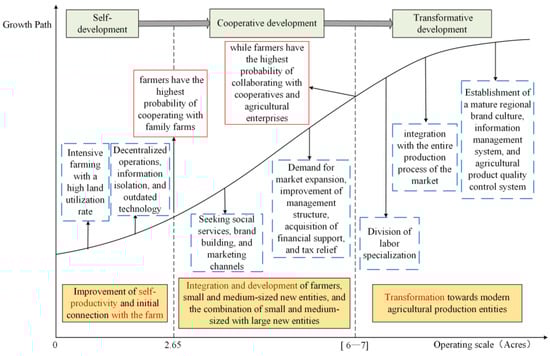 This paper points out that with the increase in land scale, the probability of cooperation between farmers and NABEs changes accordingly. Therefore, under the rigid resource endowment constraints of tense human–land relations, to resolve the conflict between dispersed and small-scale family operations and modern agricultural development, we should devote ourselves to the effective transformation of small-scale agricultural operations to the transformation of moderate-scale operations, and organically combine with agricultural organizing and socialization of agricultural services on the basis of family operation. Specifically, with the expansion of land scale, farmers should follow their own advantages and market environment to adjust in time, forming a three-stage dynamic growth curve of self-development–cooperative development–transformation and development (Figure 2):