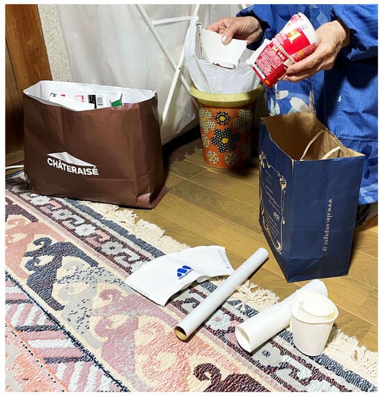 The circular system was built upon the norm that the residents were responsible for their waste management. The residents washed and dried their packages before they brought them to the Zero-Waste Center. This can be discussed as an application of the zero-waste principles where waste minimization is part of everyday life [,,]. Making waste management visible through sorting stations at home and the social interactions around it can strengthen commitment and awareness of consumption patterns. It can also be linked to how different terms were involved in shaping the standard of zero waste. One such term is ‘mottainai,’ which reflects a cultural value where the wasting of resources is seen as negative. This further strengthens zero waste as a norm in Kamikatsu. In accordance, the municipality aimed to make the lifestyle enjoyable for residents and presented a proposal for how a family can live a good ZW life in its marketing. This ambition aligns with the UD goal of Wellness and design initiatives supporting health, well-being, and safety [], and the UD perspective emphasizing that all people should have the right to enjoy universal service [].
