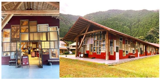 The material consisted of, for example, bricks, tiles, and fabrics that would otherwise have been disposed of. Reused farming equipment was transformed into fixtures and signage, and farming harvest containers were used as bookshelves. The photo documentation illustrates how reused glass from old houses in Kamikatsu was used as window sections (Figure 4). The patchwork was created from fixtures gathered from the residents.