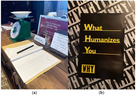The practice also involved learning how to sort waste into 43 categories. This could be complex and require continuous learning, which could be challenging for beginners or people with cognitive impairments []. Also, new immigrants or tourists from cultures without a strong recycling culture may find it difficult to adopt the concept. An opportunity, seen from this point of view, was the local method for supporting knowledge production through experience, guidance, and collaboration. These educational methods were formed over time to guide residents and visitors to reflect on their consumption and waste generation. It included moments for self-awareness through practical tasks. For example, visitors to the hotel had to estimate their own consumption of soap and coffee, as well as sort their waste and compost. This initiative could create a direct connection between consumption and waste, but also how the concept is part of the surrounding nature [,]. Weighing and documenting reused items in the designed Kurukuru shop could have contributed to concrete and measurable incentives for motivation.
