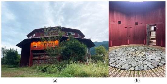 The photo documentation during the interviews illustrates the design idea of the circle-shaped building (Figure 9). This was the story of a dragon drawn on a temple that came to life and flew off into the sky when the last dot of ink was applied to its eye. It was visualized on the floor of the hotel’s entrance as an eye made of stones from the Kamikatsu River to symbolize the community and nature as part of the global society.