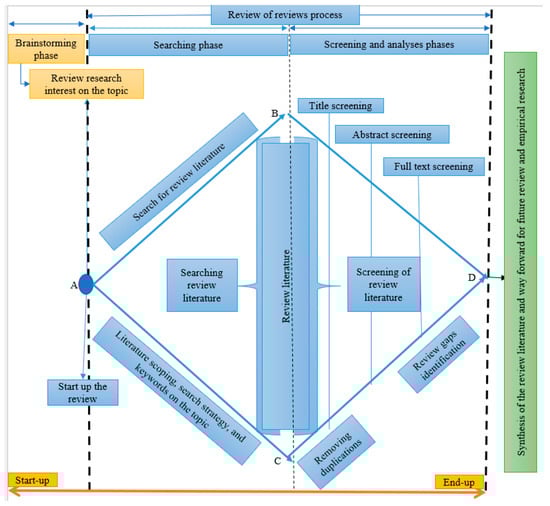 The research design for systematic literature review of reviews (systematic review of reviewed literature). A is the startup of a formal review process to search for review literature, BC spans the piles of literature in the search across the databases, and D is the end of the formal review process.