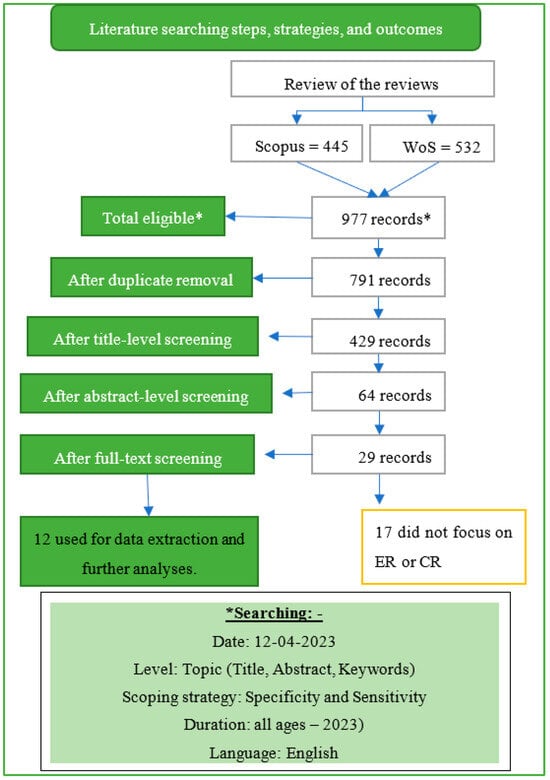 - Haddaway, N.R.; Bethel, A.; Dicks, L.V.; Koricheva, J.; Macura, B.; Petrokofsky, G.; Pullin, A.S.; Savilaakso, S.; Stewart, G.B. Eight Problems with Literature Reviews and How to Fix Them. Nat. Ecol. Evol. 2020, 4, 1582–1589. [Google Scholar] [CrossRef]