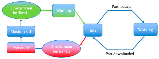 Among the various methodologies proposed for reducing energy consumption in manufacturing, the switch-off approach [6] emerges as a practical and effective strategy. Unlike other energy-saving techniques, this method does not require significant alterations to manufacturing processes or investment in new, costly equipment. The switch-off approach is conceptually akin to the start–stop technology used in modern vehicles, where the engine shuts off during idle periods and restarts as needed. In manufacturing, it involves powering down machines, equipment, or subsystems during idle periods to eliminate unnecessary energy consumption, all while preserving productivity levels. One of the notable advantages of the switch-off approach is its adaptability and ease of implementation across diverse industrial applications. This strategy can be applied to various processes, including CNC machining—where machines can be programmed to power down during inactivity—as well as welding, plastic deformation, and other operations characterized by intermittent production cycles. By ensuring machines are powered only when actively engaged in production, the switch-off policy significantly reduces standby energy consumption, thereby cutting operational costs and mitigating the environmental impact of manufacturing. Beyond its energy-saving potential, the switch-off approach offers a cost-effective solution for companies aiming to enhance their sustainability practices without significant capital investments. It is particularly valuable in facilities where machinery often remains in standby or idle modes for extended periods. Implementation typically requires minimal adjustments to existing systems, such as software updates or minor programming modifications to equipment control systems. This makes the switch-off approach a highly versatile and economical tool in the pursuit of energy efficiency. Research indicates that switch-off policies, when applied to flow lines [7,8], achieve substantial reductions in energy consumption. However, these policies can sometimes negatively impact certain manufacturing performance metrics, highlighting the need for careful analysis and optimization to balance energy efficiency with productivity.