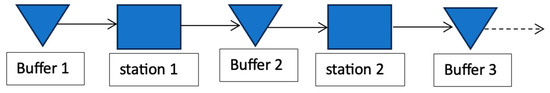 The allocation decision is primarily based on evaluating the levels of the downstream buffers associated with the pair of stations. By monitoring these buffer levels in real time, the system can dynamically adjust task allocation to maintain an optimal balance between the stations, ensuring smooth workflow and preventing bottlenecks. For example, as illustrated in Figure 2, two adjacent stations are linked by shared tasks. The downstream buffers, specifically Buffer 2 and Buffer 3, play a critical role in determining how the fractional task is allocated. If Buffer 3 approaches its capacity, a greater portion of the task can be assigned to the upstream station, alleviating potential congestion. Conversely, if Buffer 2 experiences higher levels, the downstream station can assume a larger share of the task. This strategy not only enhances operational flexibility but also improves overall line performance by adapting to fluctuations in buffer levels. It ensures continuity in production, minimizes idle time, and supports the efficient use of resources, particularly in systems where variability in processing times or demand is present. Additionally, this dynamic approach is vital for achieving higher throughput and maintaining customer satisfaction while aligning with energy-saving policies.