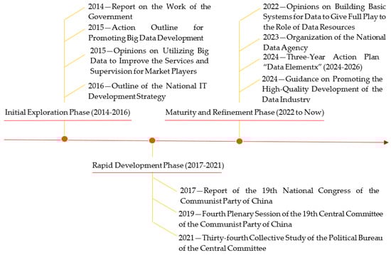 The rapid advancement of information technology has positioned data assets as critical production factors that drive both social progress and economic growth [19]. The development of DEM has progressed through three stages: initial exploration, rapid development, and maturity. The policy history of DEM development in China is shown in Figure 1.