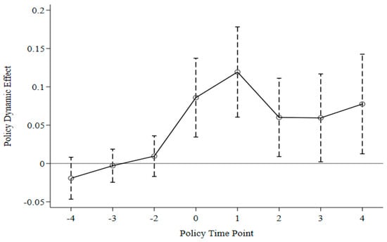 According to Table 3, the dummy year variable denotes the year in which the data trading platform for the city was established. Dummy variables were constructed for the four years before and after the establishment of the data trading platform, representing the year dummy variables for the four years preceding the implementation of the DEM policy, the implementation year, and the four years following its implementation. These variables were incorporated into the model to re-estimate the regression.