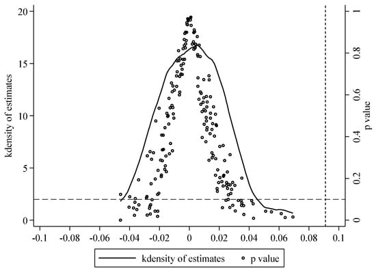 A placebo test was conducted to assess whether the observed effect of DEM on urban GTFEE was influenced by random factors. In this test, 26 pilot cities for data trading platforms were randomly assigned, and the time of the establishment of these platforms was also randomly set. A total of 300 regression simulations were performed using the generated sample data. The results of the placebo test are shown in Figure 4. The mean values of the regression coefficients followed a normal distribution centered around zero, and most p-values exceeded the 0.1 threshold. These results indicate that the impact of DEM on urban GTFEE is not driven by stochastic factors, thereby confirming the robustness of the baseline regression results.