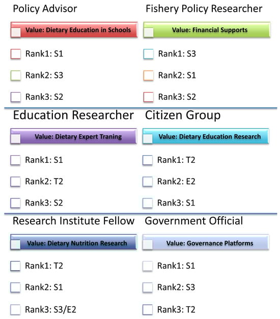 The emphasis placed by different stakeholders varied significantly across dimensions. For example, the policy advisor (Advisory Board Member) primarily focused on S1 (strategic planning, readiness, management, reaction, public health), accounting for 39.74% of their contributions. Similarly, the education researcher emphasized S1 with 28.31%, underscoring the importance of policy-level interventions and public health considerations in the comprehensive management of seafood consumption from a societal viewpoint. Conversely, the fishery policy researcher exhibited a strong interest in S3 (norms and informal practices, economic elements), attributing 24.00% to this dimension. This suggests an inclination toward exploring the regulatory framework, economic implications, and the interplay between formal and informal practices influencing seafood consumption trends. Thus, the findings highlight distinct focal points across stakeholder groups, reflecting diverse priorities in seafood consumption management. In addition, the government official, collaborating with the policy advisor and education researcher, significantly focused on S1 (29.05%), underscoring the governmental viewpoint on the strategic planning and control of seafood consumption, presumably prioritizing policy development and execution.