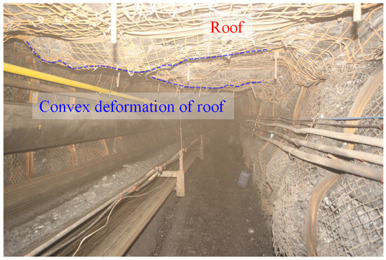 Previous studies have extensively investigated deformation mechanisms and control strategies for roadway roof strata, emphasizing global structural stability through optimized bolt–cable systems. However, these approaches predominantly overlook localized weaknesses in prestressed bolt systems, particularly the short plate effect caused by the anchorage blind zone—a triangular low-stress region in shallow roof strata between adjacent bolts. Conventional methods, such as adjusting bolt spacing or grouting, fail to address its instability under cyclic mining disturbances. As shown in Figure 1, deformation and fragmentation within this zone trigger the “net pocket” phenomenon, disrupting stress transfer, weakening anchorage performance, and initiating progressive loosening of compression zones. This study identifies the existence of the anchorage blind zone—a triangular low-stress region in shallow roof strata between adjacent prestressed bolts—and elucidates its formation mechanism through theoretical analysis. By integrating numerical simulations, we quantitatively establish the primary control factors: bolt prestress (positively correlated) and free-segment length (inversely correlated), thereby delineating the zone’s scope. Building on these findings, we propose a novel dual-mechanism support strategy combining high-prestress cables to anchor deep stable strata and short bolts to reinforce shallow rock masses. This approach uniquely addresses the “short plate effect” of the anchorage blind zone by mobilizing deep strata to constrain shallow displacements while enhancing localized self-bearing capacity. Validated through field tests in the Hulusu Coal Mine, this strategy eliminates separation fractures and ensures stable load distribution in cables and bolts without mutual interference, effectively suppressing the “net pocket” phenomenon. These contributions advance the design of prestressed bolt systems and provide a scalable framework for roof stability control in deep, high-stress mining environments.