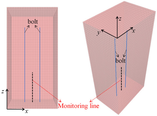 In order to verify and analyze the stress influence law of bolt length and prestress on anchorage blind zone, FLAC3D numerical calculation model is established (Figure 4). The size of the model is 3 m in x-direction, 2 m in y-direction, and 6 m in z-direction. To ensure the computational accuracy of the numerical model, grid refinement was implemented by adopting reduced mesh sizes: the refined grid dimensions are 0.1 m in the x-direction, 0.1 m in the y-direction, and 0.1 m in the z-direction. The upper and bottom boundaries of the model are fixed in the vertical direction, meanwhile, the left and right boundaries are fixed in the horizontal direction without displacement. Since we only study the prestress field of the bolt anchorage in a rock mass, each boundary is not applied with the load, and the Mohr–Coulomb yield criterion is adopted. The parameters of the model are shown in Table 1.