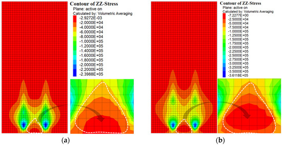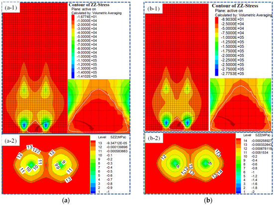 - Under the fixed bolt length (free-segment length), with an increase in anchor pre-tension, the area of the triangular anchorage blind zone shows no obvious increase or decrease, but the vertical stress value of the rock mass in the anchorage blind zone increases accordingly (Figure 5(a-1–e-1)).