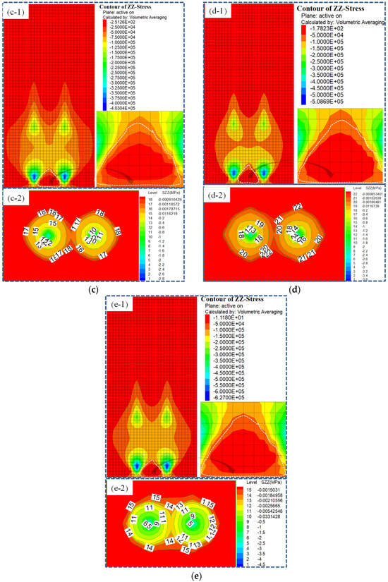 Vertical stress contour plots distribution of the anchorage blind zone in different bolt length schemes: (a) Bolt length of 3.0 m; (b) bolt length of 3.5 m; (c) bolt length of 4.0 m; (d) bolt length of 4.5 m; (e) bolt length of 5.0 m.