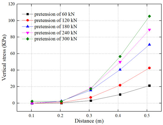 - With an increase in bolt prestress, the value of vertical stress in the anchorage blind zone gradually increases from the shallow middle position to the deep (Figure 6), which verifies the law revealed in Figure 5 and the theoretical calculation results in Section 3.1.