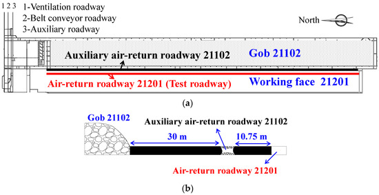 The Hulusu Coal Mine in Ordos City, Inner Mongolia Province, China, with a buried depth of 650–900 m and the thickness of 0.67–6.37 m in the main coal seam, the 2-1 coal seam, is studied. The working face 21102 is the first working face in panel 1 of the coal seam 2-1, with an average buried depth of 626.65 m and an average thickness of 2.8 m. The mining layout of “double roadways” is adopted, in which the distance between the auxiliary air-return roadway 21102 and the working face 21102 is 30 m (Figure 9).