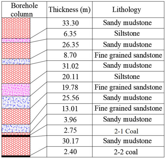 The coal seam roof is mainly composed of sandy mudstone, fine-grained sandstone, and siltstone, with a multi-layer thick-and-hard roof; the coal seam floor is mainly sandy mudstone. The direct roof of the coal seam is 3.96 m sandy mudstone, and the basic roof is 13.01 m fine-grained sandstone. The specific rock strata occurrence structure of coal seam roof and floor is shown in Figure 10.