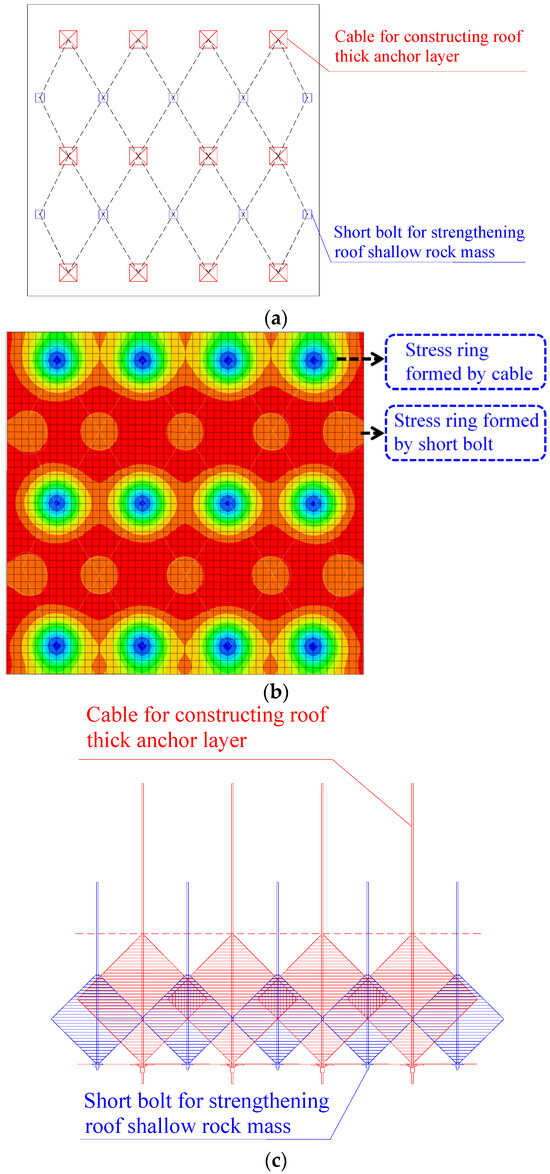 - In order to avoid the interference of short bolts on the cable and effectively control the cable anchorage blind zone, the short bolts shall be arranged near the diagonal formed by the two rows of anchor cables (Figure 11a,b). At this time, the short bolts form a compression belt in the shallow part of the roof rock stratum and the anchorage blind zone, overlapping with the compression belt formed by the anchor cable (Figure 11b,c), which effectively control the stability of the rock stratum both in the shallow part of the roof and the cable anchorage blind zone.