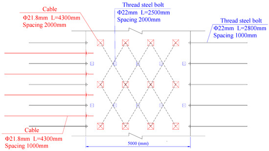 - Bolt supporting: After using anchor cables to build a thick anchor layer, five Φ22 × 2500 mm left-hand steel bolts are adopted between each two rows of cables to strengthen the shallow rock stratum of the roof. The bolts are arranged near the diagonal formed by two rows of anchor cables. The row spacing of bolts is 2000 mm, the shoulder angle anchor bolts on both sides are installed with self-aligning ball pads at an inclination of 15°, and all the rest of the bolts are installed perpendicular to the roof rock surface. Like the anchor cable, the bolts are also anchored with a resin anchoring agent, with the length of the anchorage segment is 850 mm, and the pre-tension is 60 kN.