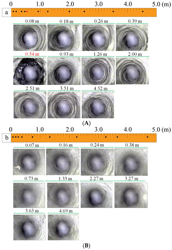 As shown in Figure 13A, the integrity of the roof rock stratum reflected by borehole peeping of the a# monitoring station is 5 m deep, and no separation fractures development is found in the shallow rock stratum (within 0–0.39 m). It is worth noting that the integrity of the rock stratum is slightly low at the depth of 0.54 m due to the existence of a thin coal seam. For the b# monitoring station, the peep depth is also 5 m, the rock strata inside and outside the anchor cable anchorage zone (0–4.52 m) are relatively integral, without separation fractures development. The rock stratum at the depth within 0.54–4.52 m of the roof has good integrity, without separation fractures development.