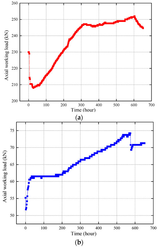 Monitoring results of the working load of anchor bolts and cables: (a) Monitoring results of the anchor cable working load; (b) Monitoring results of the bolt working load.