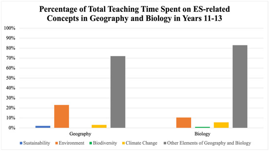 At the upper secondary level, subjects like geography and biology [22,23] do engage more deeply with environmental issues. These are the only two subjects in which ESE is meaningfully addressed, and even here, the content has limitations. Figure 2 shows that while some time is allocated to topics like climate change and conservation, biodiversity appears just once in the Year 13 curriculum—and disaster risk reduction is notably absent.