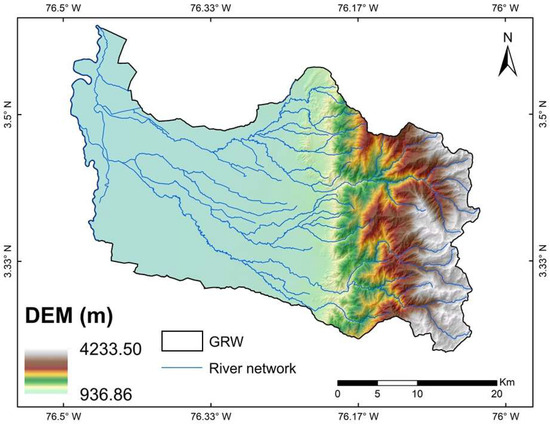The study was conducted in the GRW, located in the southernmost region of Valle del Cauca, southwestern Colombia (Figure 1). This watershed spans approximately 116,140 hectares and is characterized by intensive agricultural activity, with land use dominated by permanent crops, extensive pastures, and significant agro-industrial infrastructure, including industrial-scale sugarcane mills (“ingenios” in Spanish). The GRW was selected as a representative case study due to several critical factors: the widespread presence of agricultural land use, recurring surface water quality concerns reported in prior research, and the availability of spatial and monitoring data. Additionally, the watershed features marked topographic variation (Figure 2), making it suitable for evaluating how terrain complexity influences surface water vulnerability to diffuse agricultural pollution.
