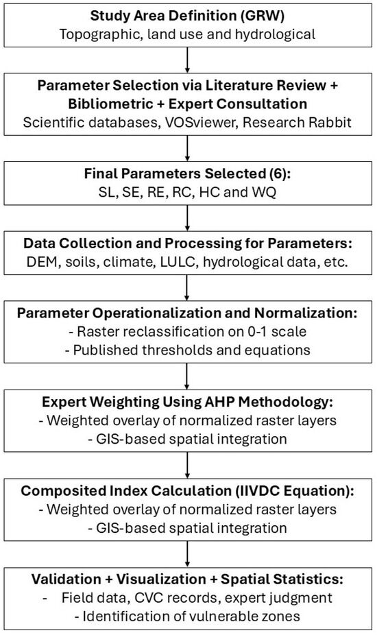 To evaluate surface water vulnerability to diffuse agricultural pollution, this study developed the IIVDC. The index integrates an MCDA framework with the AHP and GIS, providing a spatially explicit and replicable methodology. The IIVDC enables the systematic assessment of multiple biophysical and hydrological parameters contributing to water quality degradation. This framework was applied to the GRW, a region experiencing significant pressures from agricultural intensification and documented water quality deterioration. The methodological design aimed to capture the spatial heterogeneity of vulnerability factors, support decision-making, and prioritize areas for targeted land and water management interventions (Figure 3).