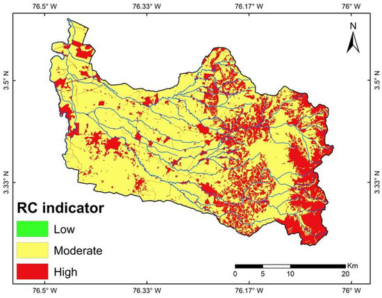 The spatial distribution of runoff coefficient-derived vulnerability (RC) reveals that approximately 71.5% of the GRW exhibits moderate runoff potential, reflecting a mixed hydrological response characterized by both infiltration and surface flow. High runoff potential was observed in 27.9% of the watershed, particularly concentrated in urbanized zones and intensively cultivated agricultural areas, including regions dominated by sugarcane production. In contrast, only 0.5% of the area was classified with low runoff potential, mainly in forested or densely vegetated zones where infiltration capacity remains high. These spatial patterns highlight how land use intensity and vegetative cover influence runoff generation and associated vulnerability (Figure 7).