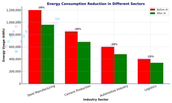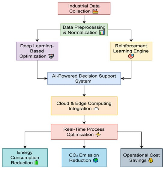 Global energy consumption and carbon emissions have increased by a great deal, further complicating the problem of climate change and environmental degradation, owing to the industrialization and rapid expansion of manufacturing processes. It is industrial operations that contribute the most to greenhouse gas, especially in the steel, cement, and logistics industries. Increasingly, industries are under the regulatory and sustainability spotlight as such frameworks and global sustainability initiatives as the Paris Agreement place tighter and tighter carbon reduction targets on them [1,2] and are required to adopt innovative, energy-efficient solutions to reduce their environmental footprint. In response to these demands, Artificial Intelligence (AI) is emerging as a transformative technology that can solve industrial energy consumption, waste management, and most automated processes [3,4].