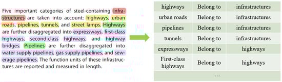 Combining the Wikifier API and the open-source relationship extraction toolkit OpenNRE (https://github.com/thunlp/OpenNRE, accessed on 2 March 2025), ontologies are identified and located from the text to extract possible relationships between entities. The recognition results are then classified into predefined categories, and an example of this application is shown in Figure 2.