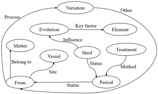 Ontology relationships are defined on the basis of three levels: concept, entity, and relationship. The relationship between the same node and its different status nodes is the ‘status’. The relationship between other status nodes in the same process is defined as the ‘process’. The containment relationship between nodes is denoted by ‘Belong_to’. The relationships between nodes and node-related elements are mainly the location ‘Site’ and the conditions ‘Additive’, ‘Temperature’, ‘Gas’, ‘Energy’, ‘Method’ and so on. The relationship between industrialization and urbanization in the process of iron and steel mineralization is ‘Influence_relation’, in which the relationship between industrialization and urbanization and their influencing factors is defined as the ‘Key factor’, as shown in Figure 3 [43,44].